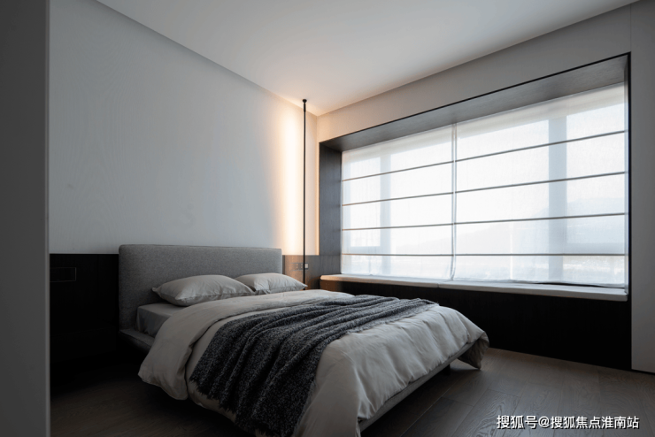 设计师巧妙运用了白色与灰色的和谐搭配,营造出一种宁静而高雅的空间氛围。房间中心的大床,以白色被褥为基底,搭配黑色的抱枕,不仅体现了色彩的对比美,也增添了空间的层次感。