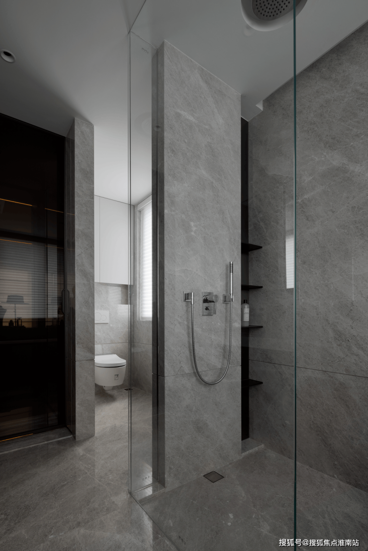 浴室以灰色为主色调,地面与墙壁铺设的灰色瓷砖不仅增强了空间的整体感,还易于清洁保养,符合现代家居的实用需求。左侧透明的玻璃淋浴间设计,不仅让浴室空间显得更加宽敞明亮,还巧妙地实现了干湿分离,提升了使用的便捷性和舒适度。