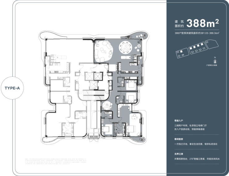 主力户型为建面约180–388㎡的三至四房,另有少量585–744㎡的顶层复式及大宅产品