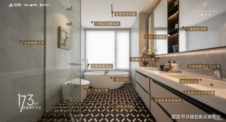 滨江咏舟府售楼处电话☎:400-998-9694✔✔ 卫浴间采用灯光一体镜柜、肌理皮革饰面抽屉,主卫镜柜还内置美妆冰箱……
