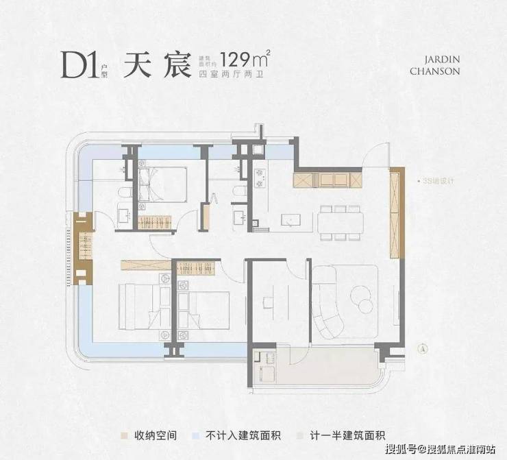 项目建面约 128㎡4房户型延续了前作3S墙的设计,保证了收纳空间的丰富性。