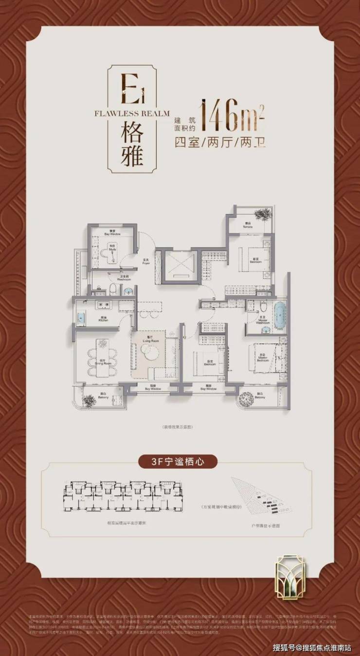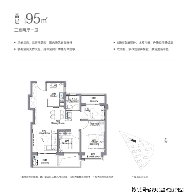 再加上南向大面宽短进深、全卧飘窗、L型转角阳台设计,哪怕小户型95㎡3房,尺度感都超棒,采光和视野更是一流。