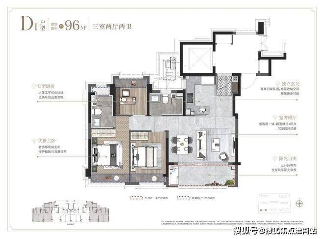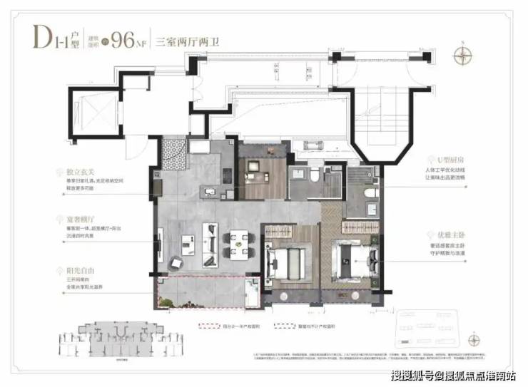 ①建面约96㎡3房户型: