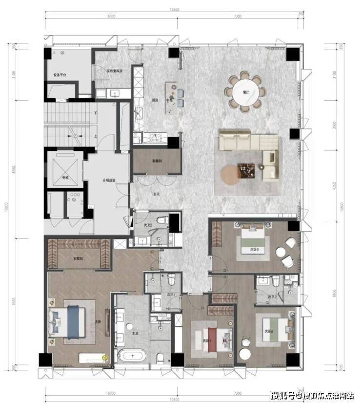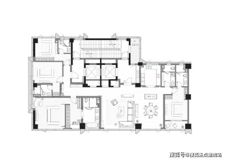 横向L型走廊,开阔洄游动线模糊界限,放大空间的优势拓宽视觉感受,同时,LDK一体化全家庭社交厅,动静分区、南北通透、岛台设置……空间以相互交错的平面圆弧为层次结构,在互动间让心灵情感升温,带来全维感官享受上的跃升。