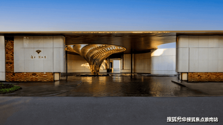 在门庭外,辅以两侧具有仪式感的跳泉水景,将建筑的圆弧美感与自然水景相合,共同构成海上·清和玺“贵雅清和”的城市界面。
