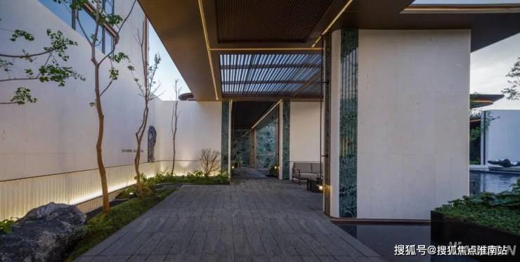 穿过归家大堂,入眼的便是大片的镜面摩登水院,涌泉叠水,高低错落、动静相宜。景观设计团队更是在水院里做了一个下沉式卡座,未来业主可以在这里闲坐观景,与三五好友可以畅聊天地。