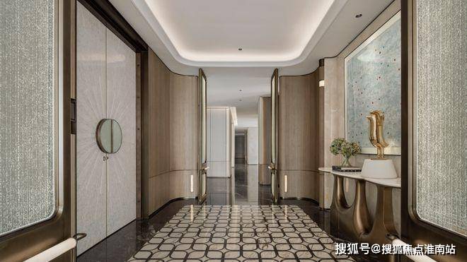 杭州-时舟里售楼处电话☎:400-881-8994(预约看房热线)透过鞋柜看向过道,门全部做了到顶的处理,中间的腰线在公共开放区域是整体贯穿的元素,并结合柜门的开启高度,硬包的中线高度等等做了一个整体的联系。