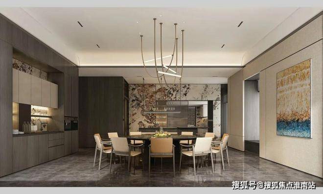 杭州-时舟里售楼处电话☎:400-881-8994(预约看房热线)开放式的客餐厅设计,吊顶侧边一些细节的处理与柜子的钢条和大理石的分缝有一些联系,整体立面的横向缝隙的高度都有一些相应的联系,让空间的感受更为整体并且相互之间有一些联系。