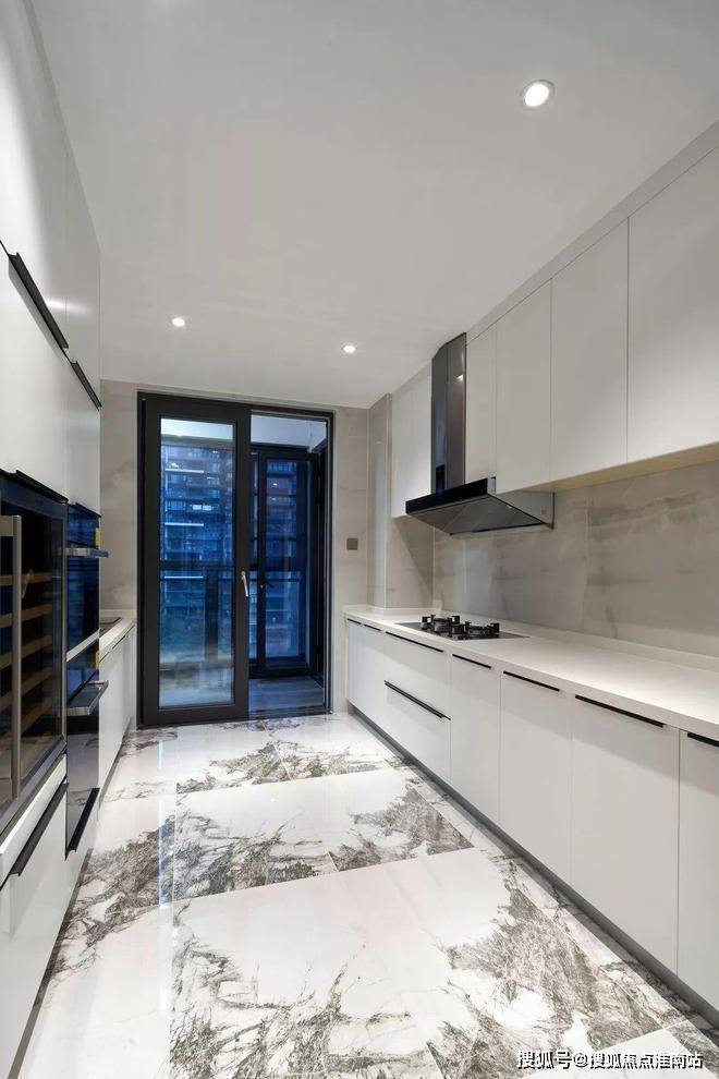 厨房延续了客厅的瓷砖没有做门槛石,恒温酒柜、蒸箱烤箱、洗碗机应有尽有,墙面的颜色和柜体都用了整体烤漆的白色,简单素雅。