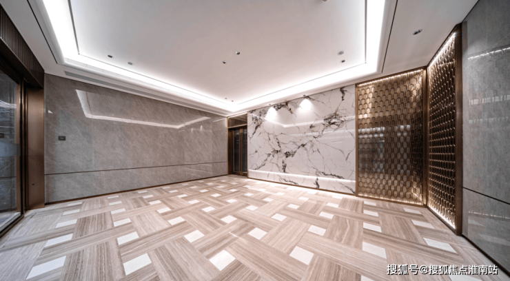 地下归家大堂,电梯厅的地面都是木纹拼花石材,呈现视觉美。