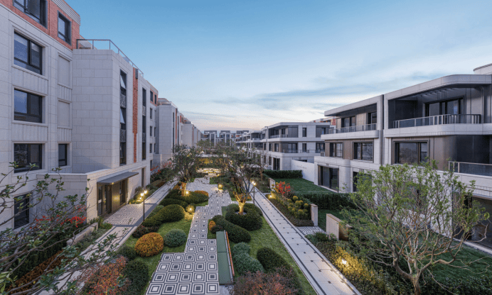 园林打造“三轴、两街、十大组团”景观体系,将海派花园意境与滨江生态相融,全冠移植名贵苗木,搭配休闲步道、水景小品,移步易景,重现衡复风貌区的隐奢氛围,营造城芯度假式居住体验。