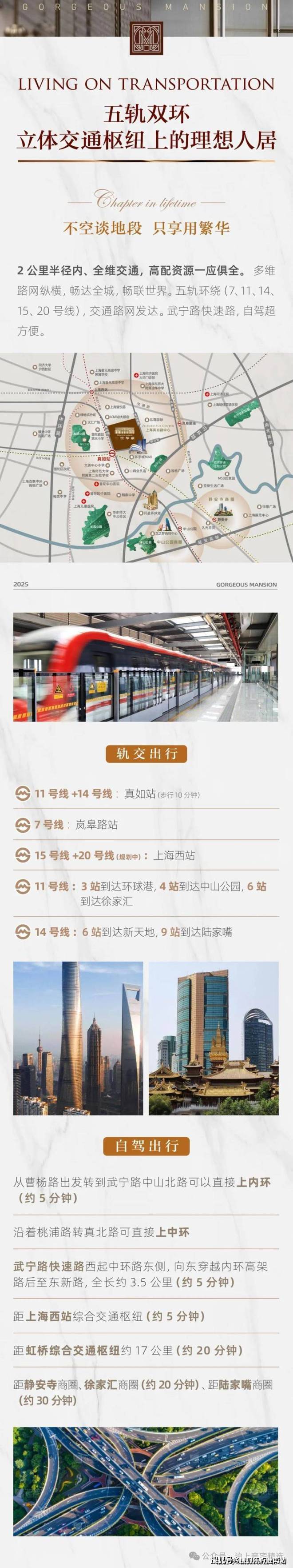地铁:5轨环伺,项⽬旁真如站地铁⼝ (11号线/14号线), 1公⾥上海⻄站地铁⼝ (15号线/20号线), 1.5公⾥岚皋路站 (7号线)。