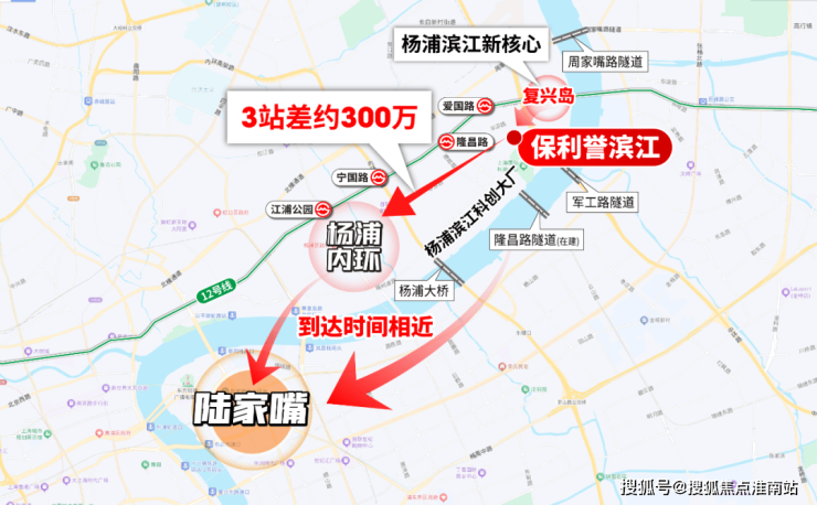 意味未来在复兴岛工作的大量人群,无法在岛内实现居住需求,必须向外寻求高品质住宅——而保利誉滨江,正是杨浦滨江所有新盘中距离复兴岛最近的项目(直线复兴岛约300米),自然成为复兴岛居住需求外溢的“第一站”。