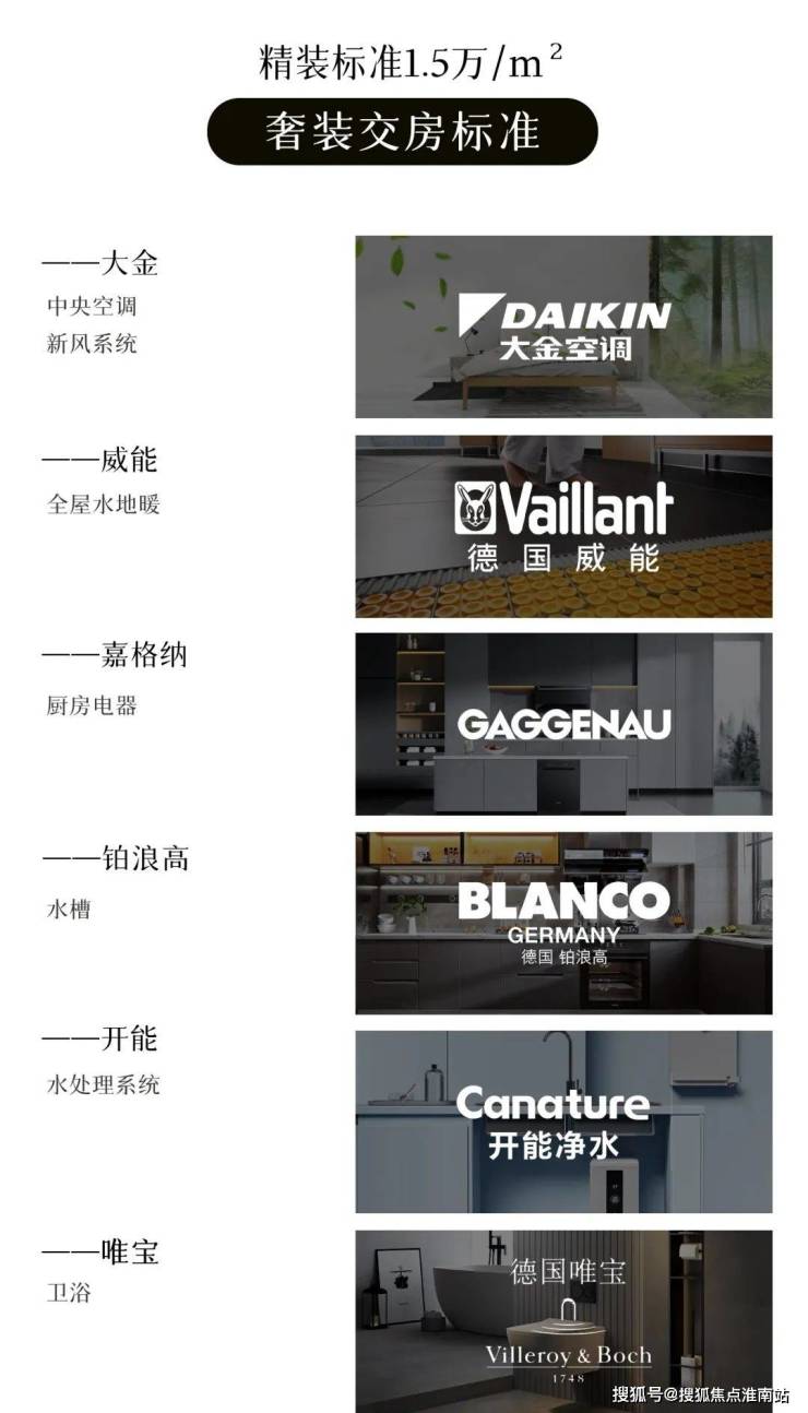 精装标准达1.5万/㎡,含德国柏丽橱柜、大金中央空调等;