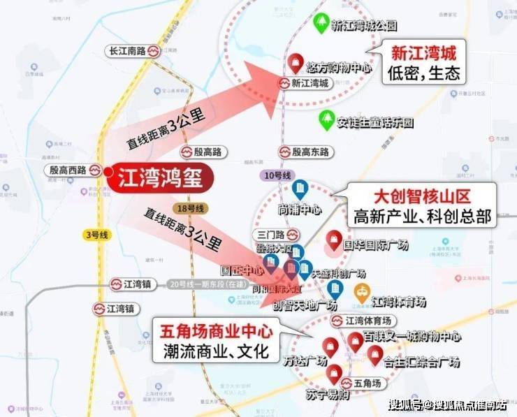 生活配套非常成熟,新业坊·源创就在西侧,吃喝玩乐都能满足,潮流、精致元素也为板块注入更多活力。殷高西路上还有永辉、长江国际、景瑞生活广场等商业。如果要大商圈,项目自驾到五角场商圈、宝山万达、悠方购物中心、大宁商圈、虹口龙之梦也十分便捷。