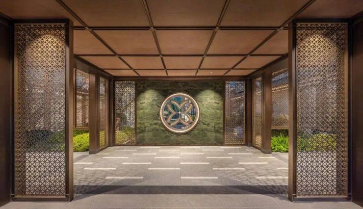 采用“王府中式”设计,大门为歇山顶形制(宽53米、高近11米),配黄铜狮、罗汉松及蓝翡翠奢石。园林融入西湖十景元素,如“花港观鱼”水景、“柳浪闻莺”绿植,并设雾森系统首层单元门厅石材铺就,肌理沉稳。