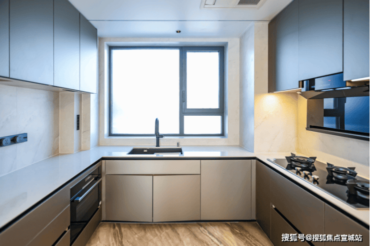 厨房为U型布局,配备博世四件套厨电,包含三眼灶、油烟机、洗碗机、蒸烤一体机,还有科勒抽拉龙头及日立厨房空调等高端品牌,中岛与飘窗休闲区相连,扩展了操作与互动场景。