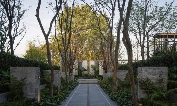 约100米长的私家礼道,两侧4米高景墙庄严夹道,整整齐齐的香樟树撑起"绿色的华盖"