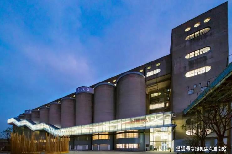 红砖建筑改造为总部办公+艺术空间;8万吨筒仓顶层打造一线江景观景餐厅,中区引入美术馆/演艺空间,低区保留储粮漏斗改造成艺术展览;