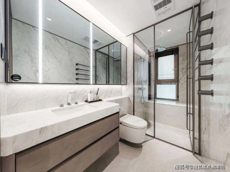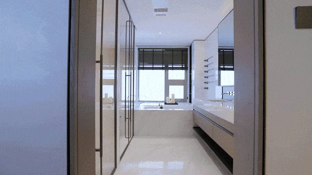 主卫既私密又尊贵,当代的双台盆,劳芬的独立卫浴洁具空间、独立淋浴空间配备当代的花洒,当代浴缸外接飘窗,便于收纳,顶部有松下暖风机,还配置了电热毛巾架,可谓一应俱全。