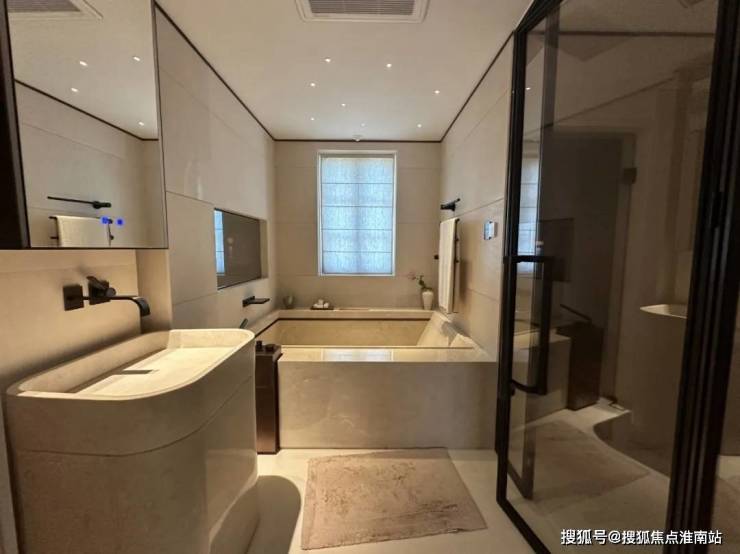 而样板间里这第二个卫浴空间,更接近于享受级。嵌入式浴缸,设计了魔镜系统,可以供业主泡澡时观影娱乐;除此之外,这个卫生间也有独立的淋浴房,并设计有桑拿房。