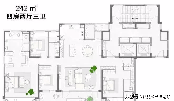 该户型同样为四房两厅三卫,建面约240㎡户型的缩小版。