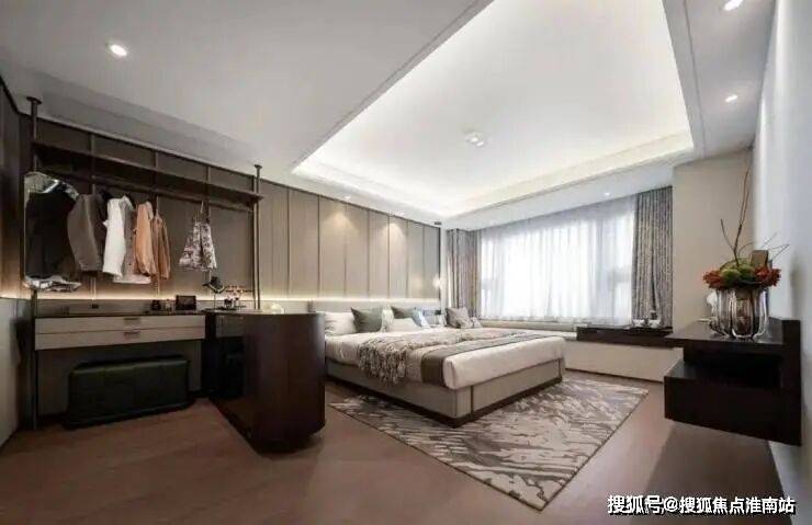 主卧豪华套房,面宽约5.4m,带衣帽厅和奢华卫浴体系。值得一提,还有一个南向次卧套房,卫生间也是朝南设计,避免暗卫。