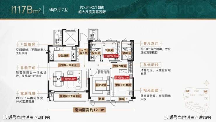 约12.1米南向面宽,约5.8米宽尺横厅,