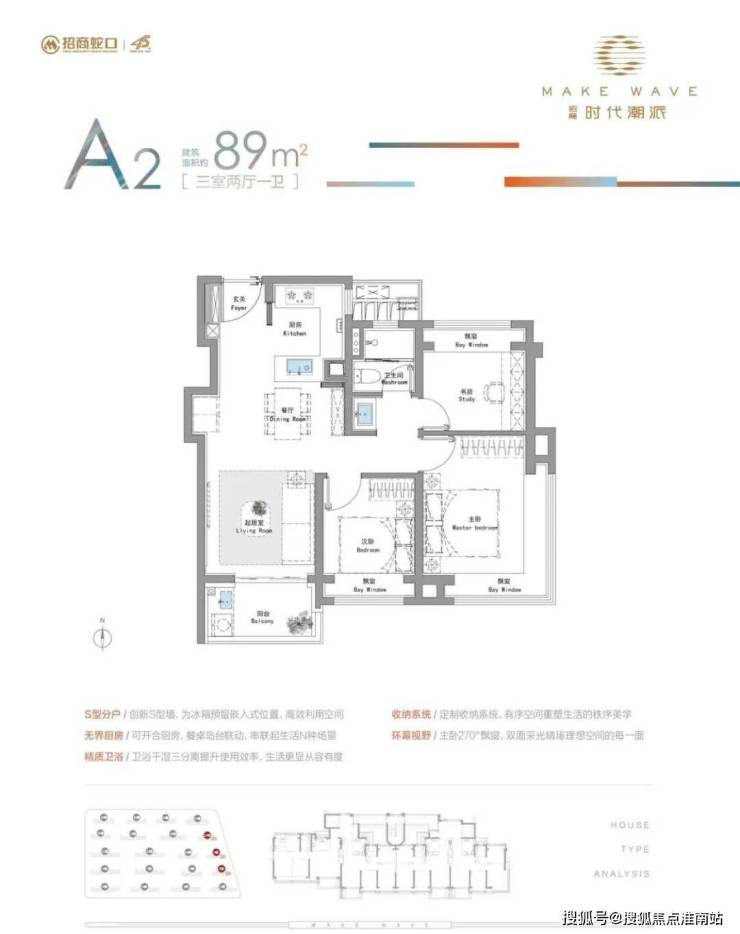 建面约89㎡3房户型: 东边套主卧配置约270°双向采光飘窗、S墙设计,主力总价仅约450万级,首付约90万起!