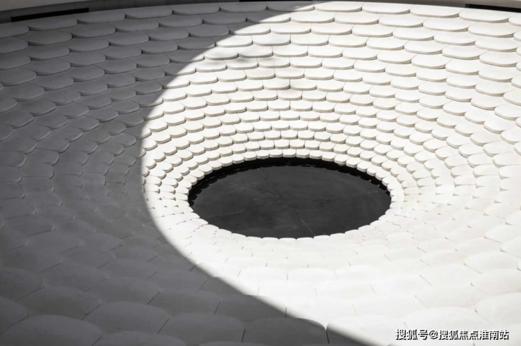 浮光池院水院会客厅,现已实景呈现,水景中央的艺术小品,如一滴水在湖面晕开,泛起阵阵涟漪。