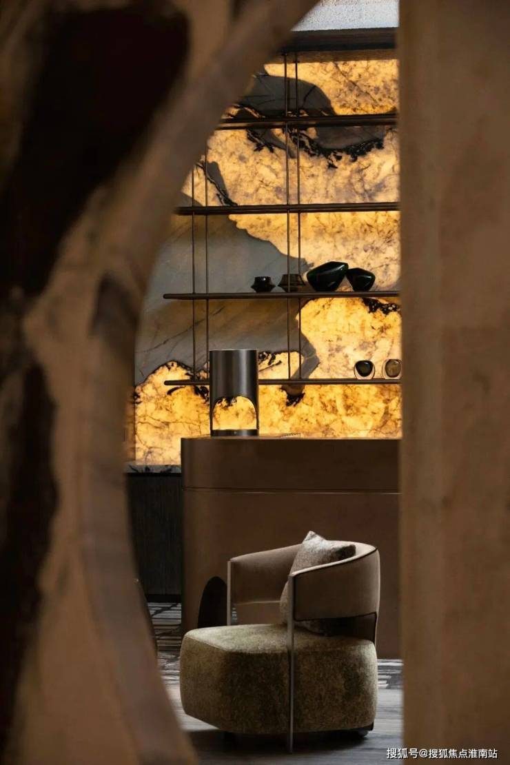 用昂贵的幻彩红奢石,把砖墙的直角做成了更优雅更昂贵的弧线圆角,与红砖形成了更丰富的肌理变化。精心镶嵌的金属线条,勾勒出了建筑的璀璨轮廓。入口处的弧形转角大幅落地玻璃窗,带来高奢酒店的氛围。站在街边,你已经可以看到庭院中的巍巍劲松探出一角,引发你步行归庭的情绪。