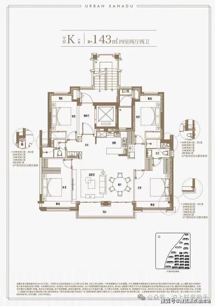 全套户型图如下,户型为建面约105-128-136-143㎡3-4房。叠墅139-143㎡!