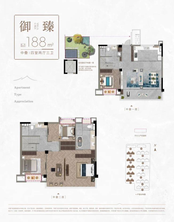 · 中/下叠:188㎡ 四房两厅三卫,下叠赠送约35㎡南向花园,中叠赠送约15㎡北向花园。