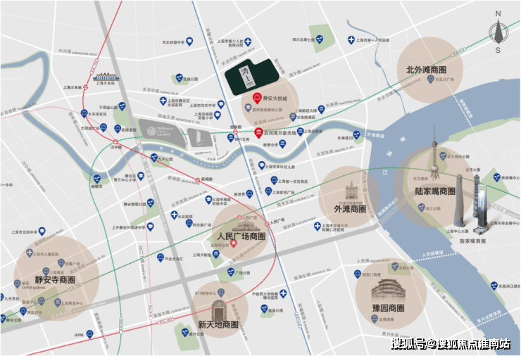 商业方面:项目附近的福新汇-1层到4层包含全生活业态,东侧华润苏河湾打造的中央公园中,地下部分全部为城市商业,约500米左右静安大悦城、1站人民广场、3站黄陂南路(步行约60米新天地)、3站静安寺,轨交10分钟内便有上海最大、最繁华的商圈。