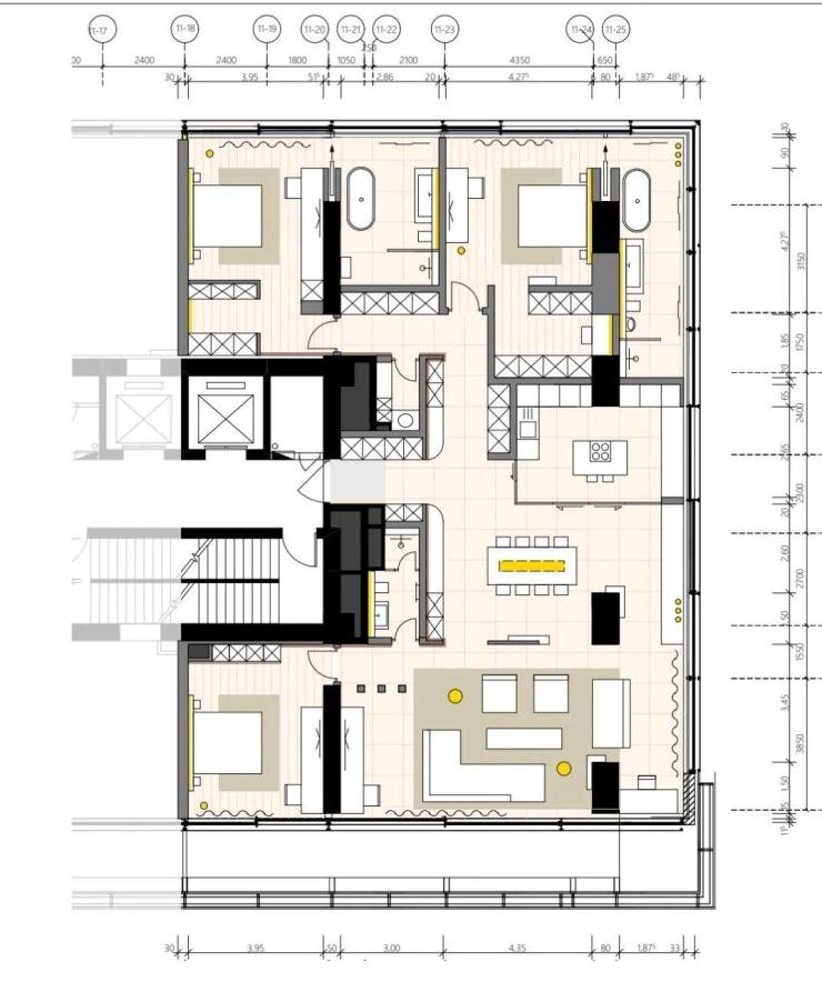 项目以德国包豪斯风格为建筑灵感,创新打造全落地玻璃墙高层住宅,由德国Obermeyer建筑设计事务所与德国Dibelius建筑事务所联袂设计。厚板框架建筑结构,开创了住宅自由定制户型的新模型(项目的科技系统都在地面或是顶棚,后期户型可以自己调整)