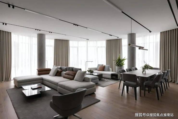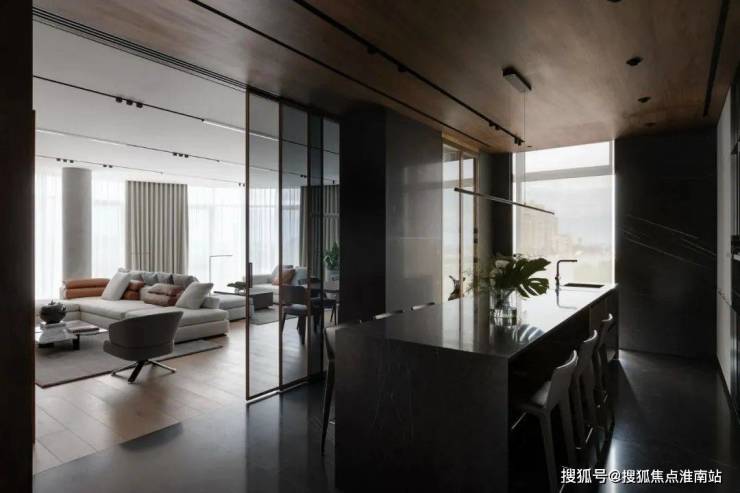 大大的空间,视觉感强烈,移动的玻璃门把客厅和厨房餐厅隔开,中央岛台和餐厅一体,线条简单,原木色天花和光线烘托出强烈的戏剧感。