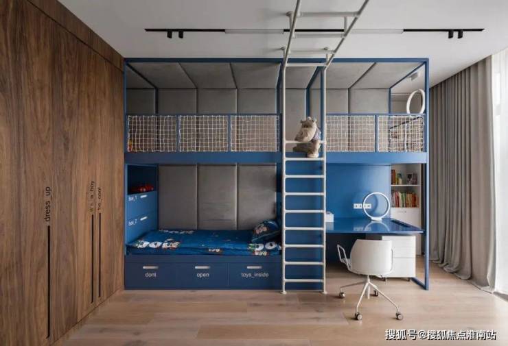 男孩房在主色调的基础上增添了蓝色用以装饰,用色彩传递情感,各种运动器材满足男孩的好动天性。