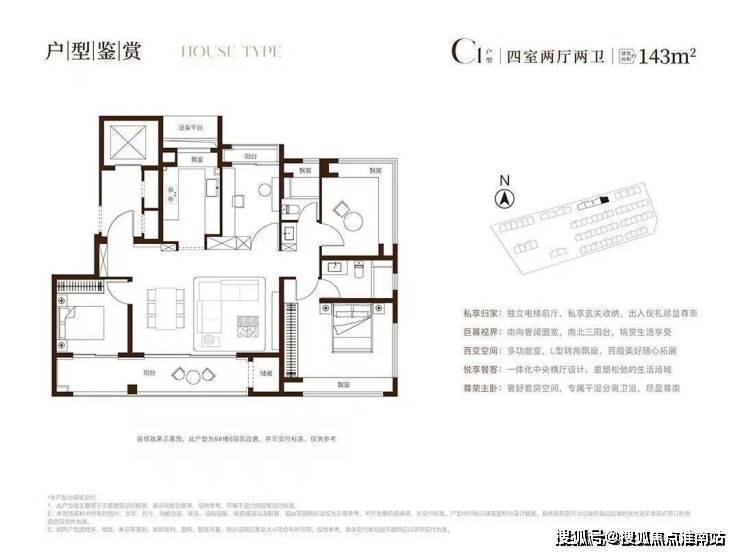 项目主打纯粹改善社区,在售户型涵盖3-4房高层产品,主力建面约119-143㎡: