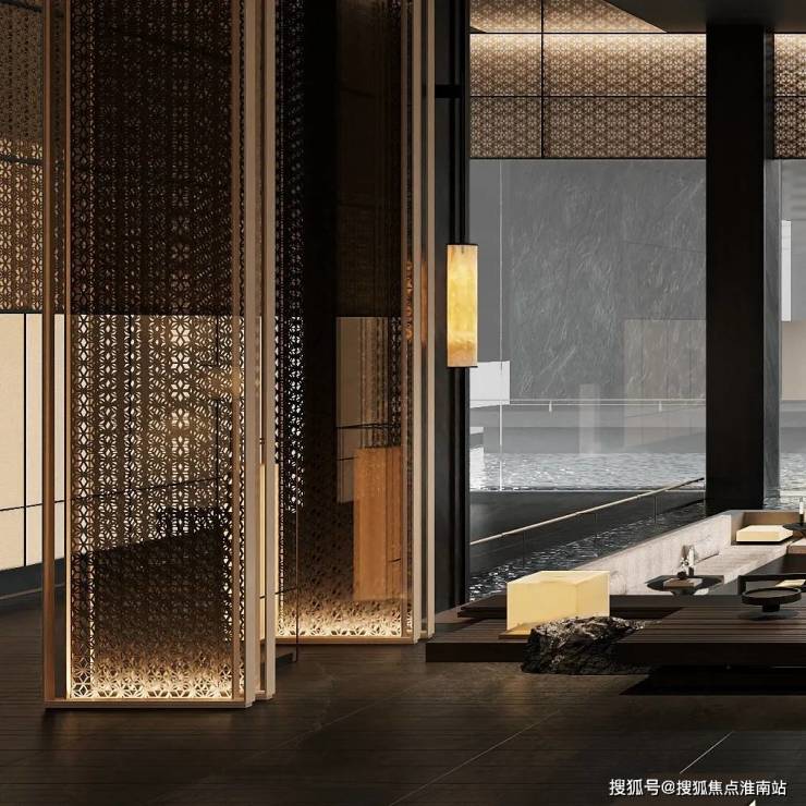 设计师将古梅的形象提炼抽象的装饰符号,通过屏风、格栅、风铎等装饰细节融入到宋式风格中,既传承了文化特色,又为设计增添了细腻、精致和奢华。