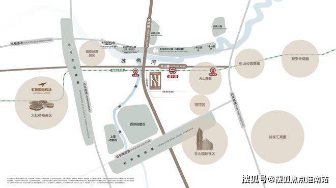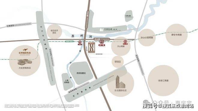 项目东至天山路31号、南至新渔东路、西至北虹路、北至天山路轨交变电站,近邻苏州河,距离地铁2号线北新泾站直线距离仅约300米。