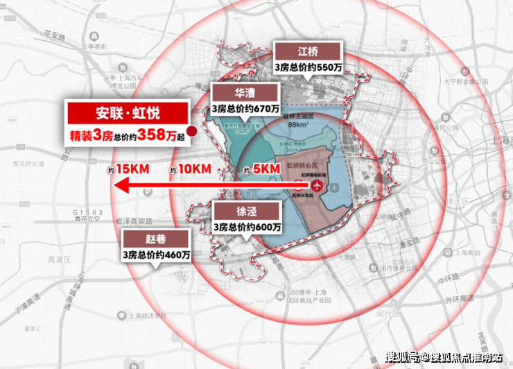 以虹桥火车站为圆点,10公里为半径,几乎所有板块新房价格都逼近甚至超过6万/㎡,4字头的华新甚至比二线辐射板块赵巷还要实惠!