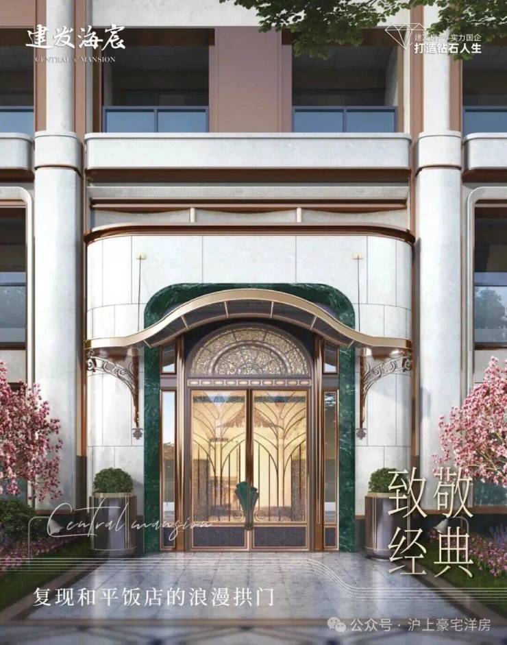 萃取东方色谱精粹,建发·海宸甄选丝箔流金、东方雅铜,青釉奢蓝,以当代笔触晕染立面,令传统色彩在空间生长为永恒的诗意, 「入户门头」形取和平饭店经典拱门,配以碧绿色天然石材门套、彩玻花窗,重现百年外滩门廊的尊崇仪式。