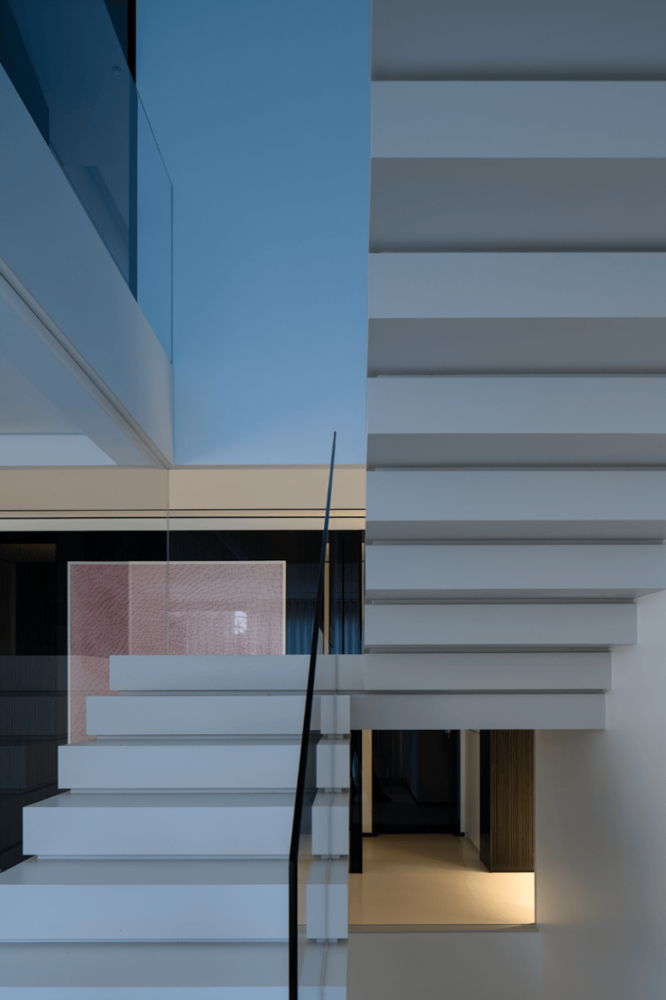 私密场域依旧保持静谧,黑白色基础上搭配了更多的色彩,例如深棕、浅紫等,艺术品的衬托深邃迷人,热络了家的氛围。