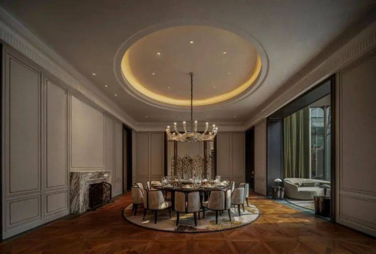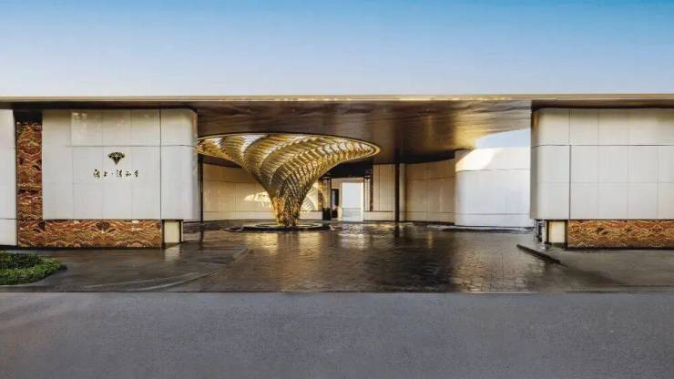 门庭延街的外立面,以精工定制弧形米色石材为主调,镶嵌典藏级老虎玉大理石,点缀古铜色现代海派艺术感灯器,整体呈现出百年海派的贵雅气质;在门庭的环岛空间,景墙面采用中轴对称的设计布局,定制了奢石镶嵌装饰,将曲面艺术与经典石器之美圆融交融。