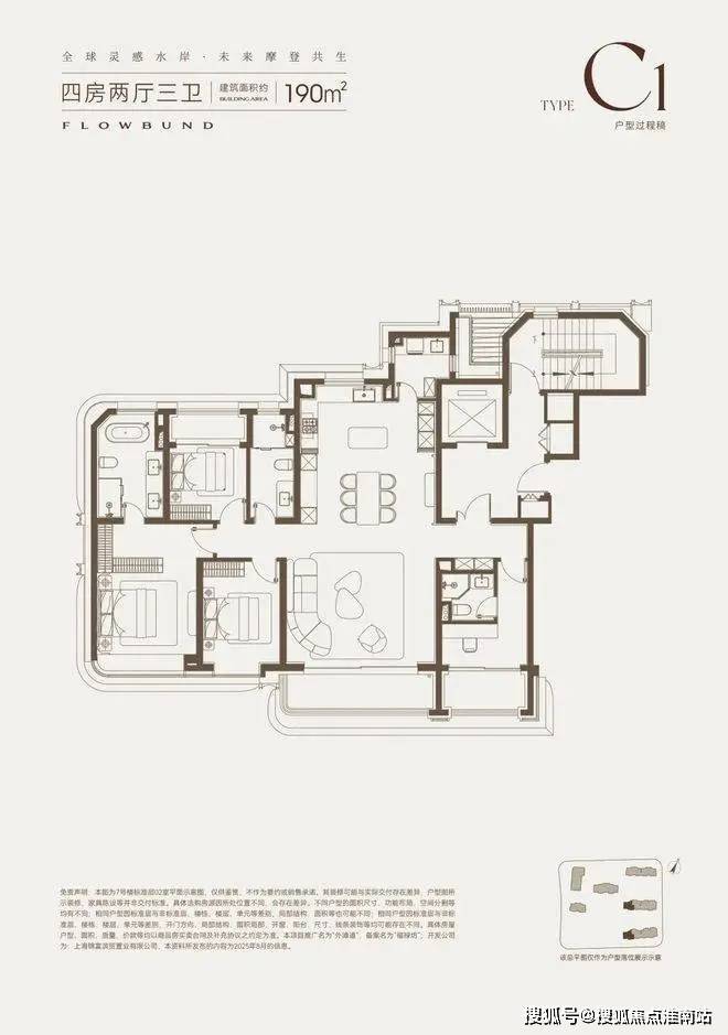 建面约190㎡四房,约3.15米的层高,塑造出极具立体感的纵向空间;