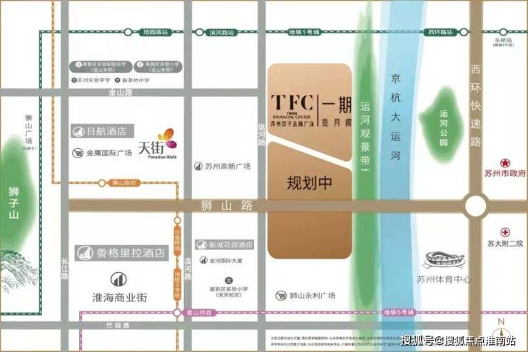 本项目在狮山 桥下,京杭大运河旁,占据了新区狮山板块的核心地段,坐享新区繁华商圈,紧邻姑苏古城风韵,集人文精神和高品质生活为一体,将打造为狮山板块乃至苏州市具有代表性的地标建筑。