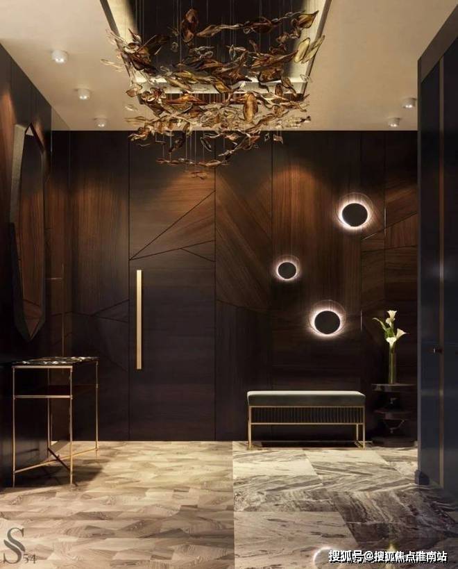 衣柜是用天然皮革和木材制成的,地板是RexCeramic制成的,顶上的吊灯也是定做的。