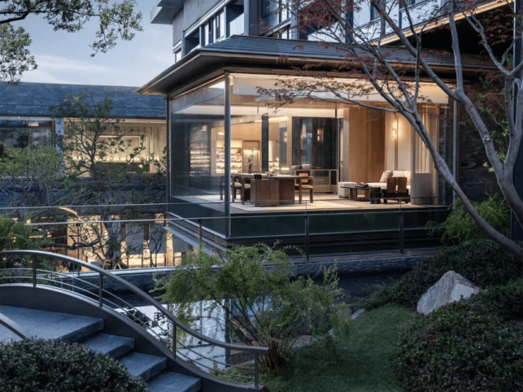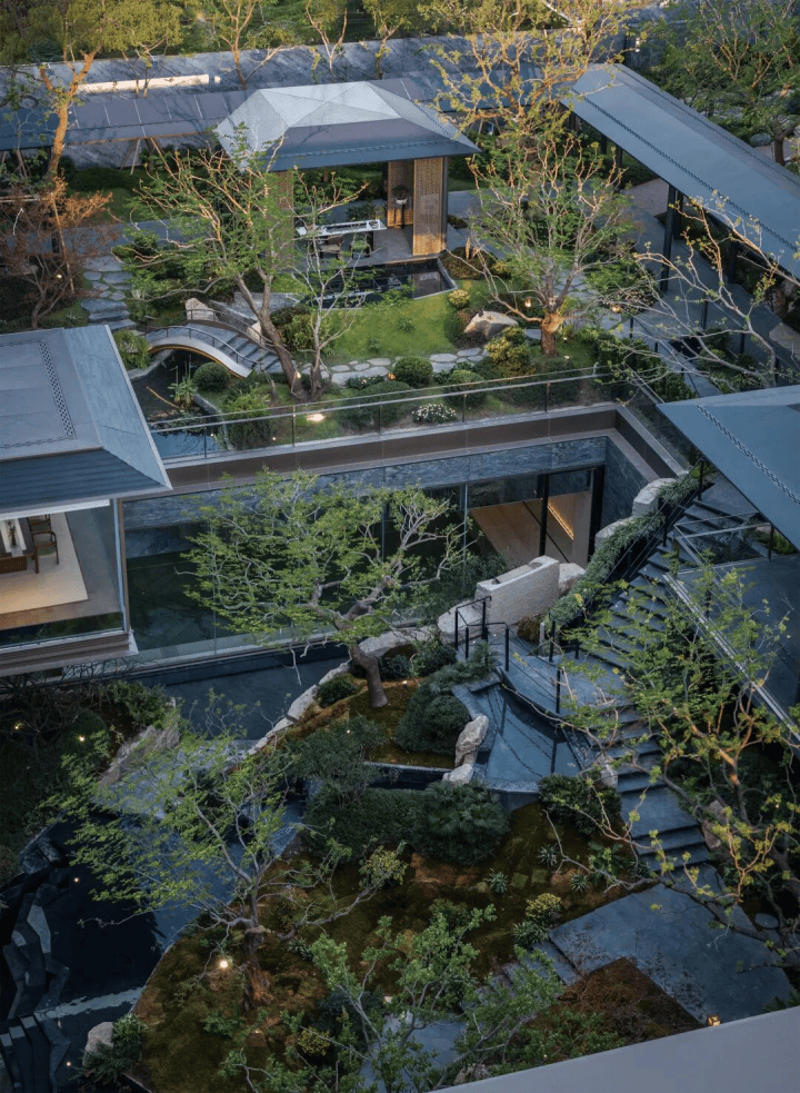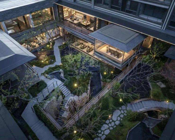 近460㎡的下沉式庭院,精选太行山金景石堆叠成小山丘,溪水,并移栽岭南珍贵的古桩铁冬青和中华原生乌桕树,寓意“聚财守业”!