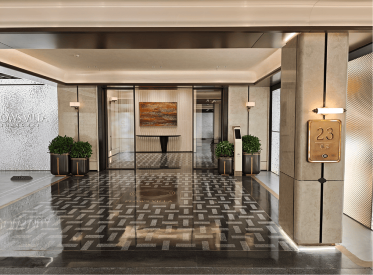 首先是小区南侧的次入口,进门第一个最吸引人的地方就是玉石照壁,75片珍贵的玉石用金属拼接起来,寓意着「金玉满堂」。