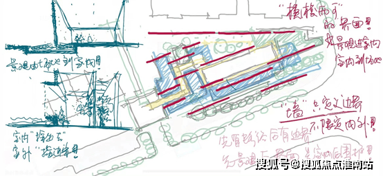 在体量之间创造入口礼仪院,水院及内院空间,串联建筑体块,别有洞天。在空间洄游中,强调步移景异模糊边界,和园林景观互融共生,面对天镜湖打造极致的观景体验。